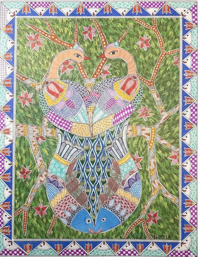 work in science, she is a passionate artist specializing in Madhubani art—a vibrant Indian folk tradition